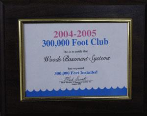 Woods Basement Systems received this award after 300,000 feet of materials were installed.